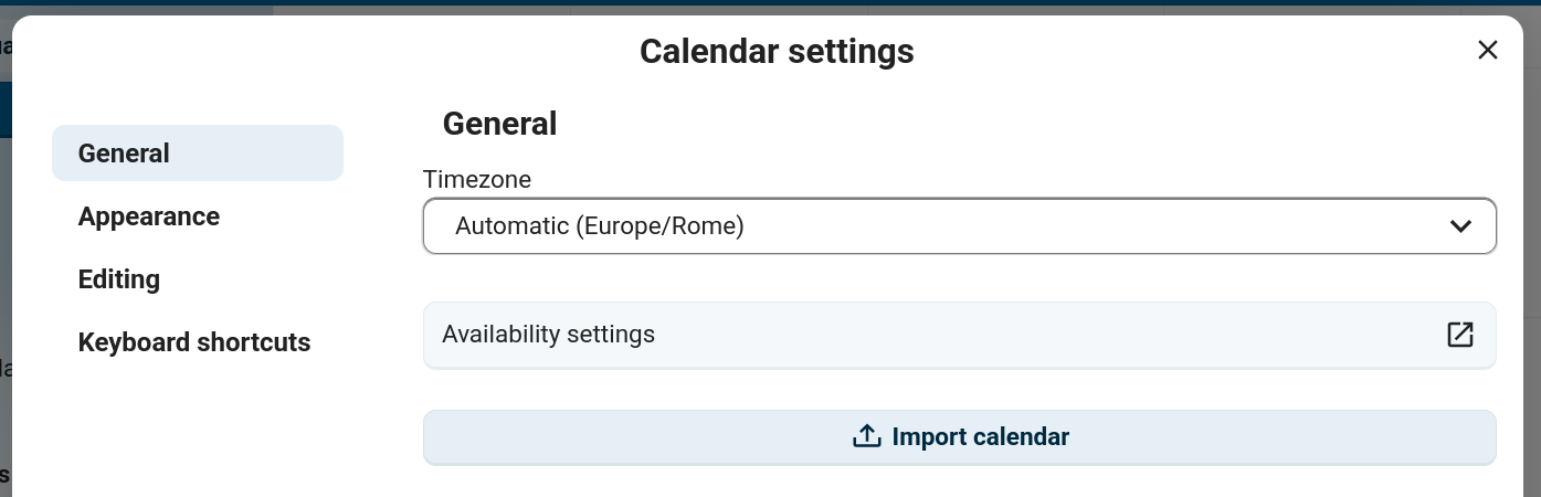 Import Calendar, found in theGeneralsection, you can select one or more calendar files from your local device to upload.Select a