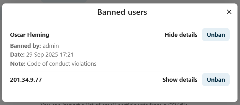 To help keep discussions safe and under control, moderators can ban participants from conversations. It could be internal users or guests (in this case their IP-addresse will additionally be banned).