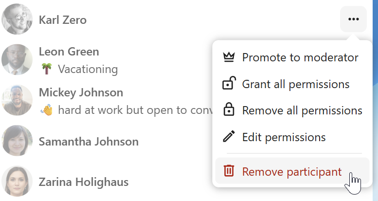 In the participants list, select the user or guest you, and click Remove participant.