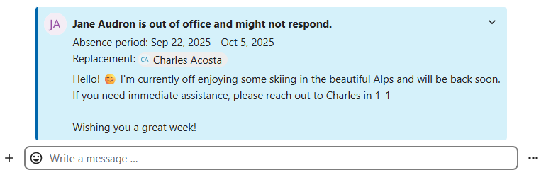 If a user becomes unavailable and set an out-of-office status in Personal settings > Availability, you will find additional information in this conversation, such as provided description, absence date, or their replacement person.