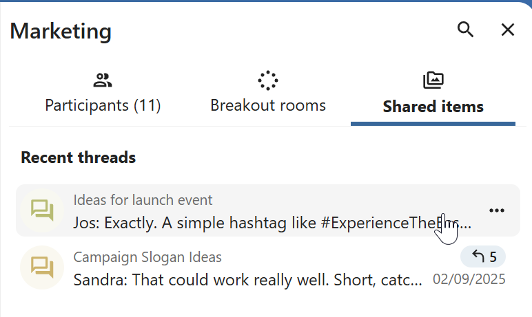 You can view all replies in a thread either from the replies button on the message or from Shared items tab in the content sidebar.